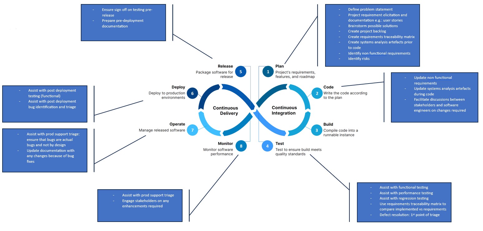 As business analysts we often find ourselves operating in various contexts. Whilst there is a generally understood sequence of events in the typical software development lifecycle, we are often required to adapt to the delivery method within a project team or at a client. There is increasing focus on Dev(Sec)Ops which expanded stands for development, security and operations – an application practice that is essentially centered around continuous improvement, ownership and transparency. A simple google search on Dev(Sec)Ops will yield many a result around how a software engineer can approach Dev(Sec)Ops, but what about us as business analysts?