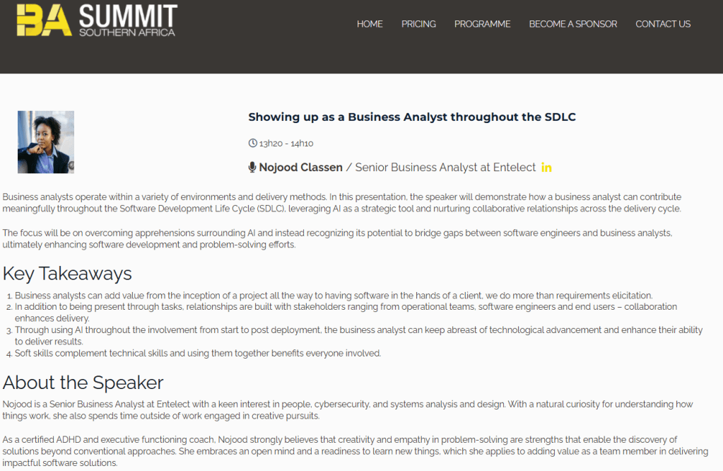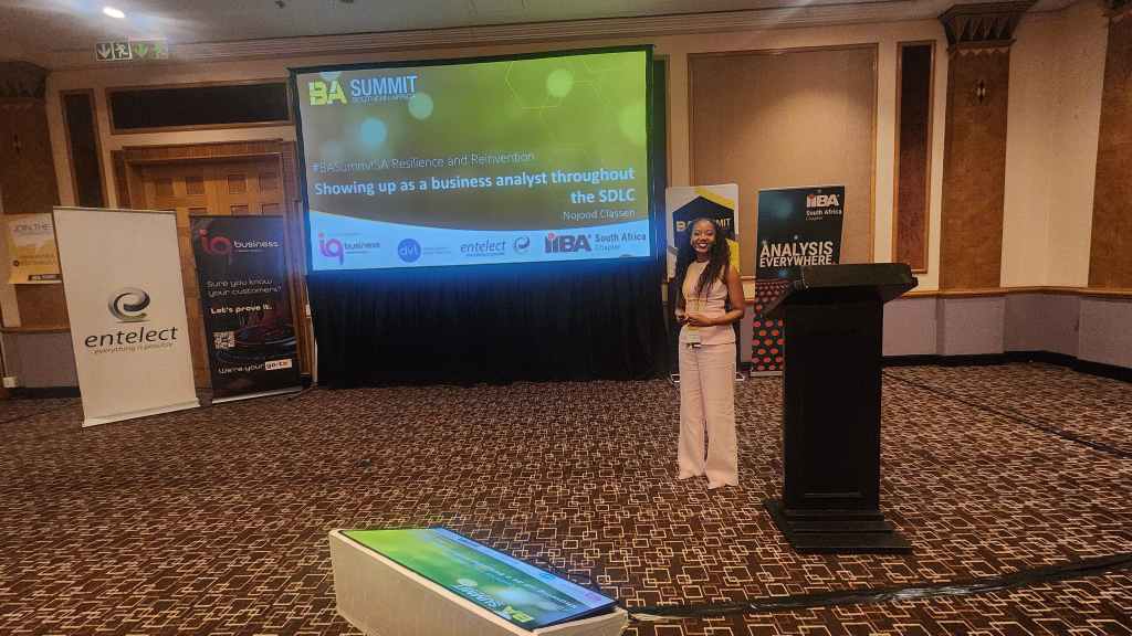 I was given the great honour of being a speaker at this year’s BA summit – an event dubbed the business analysis event of the year, hosted by the South African chapter of the International Institute of Business Analysts. The theme was “resilience and reinvention: business analysis in a fast changing world.” With the widespread adoption of AI, it is natural that there would be concerns about where we as business analysts fit in and how we can use AI to our advantage and solidify our position in the newer paradigm of work. There were many insightful talks which were within the categories of resilience in action, resilience by design and reinventing with tech. Sne Dlamini, the group vice president of technology at AECI limited and Miles Khubeka, founder of Vuyo’s restaurant, delivered inspiring key note speeches on day one of the conference. In their talks, both Sne and Miles highlighted the importance of recognising and respecting the humanity in others and strategic thinking and positioning. On day two, we had an opening key note speech from Filip Hendrickx on the business analyst as a leader – inviting business analysts to be more conscious about showing up as a leader and being situationally aware. To close off the day, an executive panel discussion about what the future business analyst looks like, provoked thought and meaningful discourse, featuring IIBA non executive director, Ryan Folster, Riaz Moonda, the head of analysis at IQ business and Makopi Nkopodi, a group technology executive at Nedbank. It was a jam packed programme with many speakers offering awesome golden nuggets, I wasn’t able to attend all of them but the ones I did were illuminating. It was fantastic to meet other business analysts who are passionate about their craft as well.